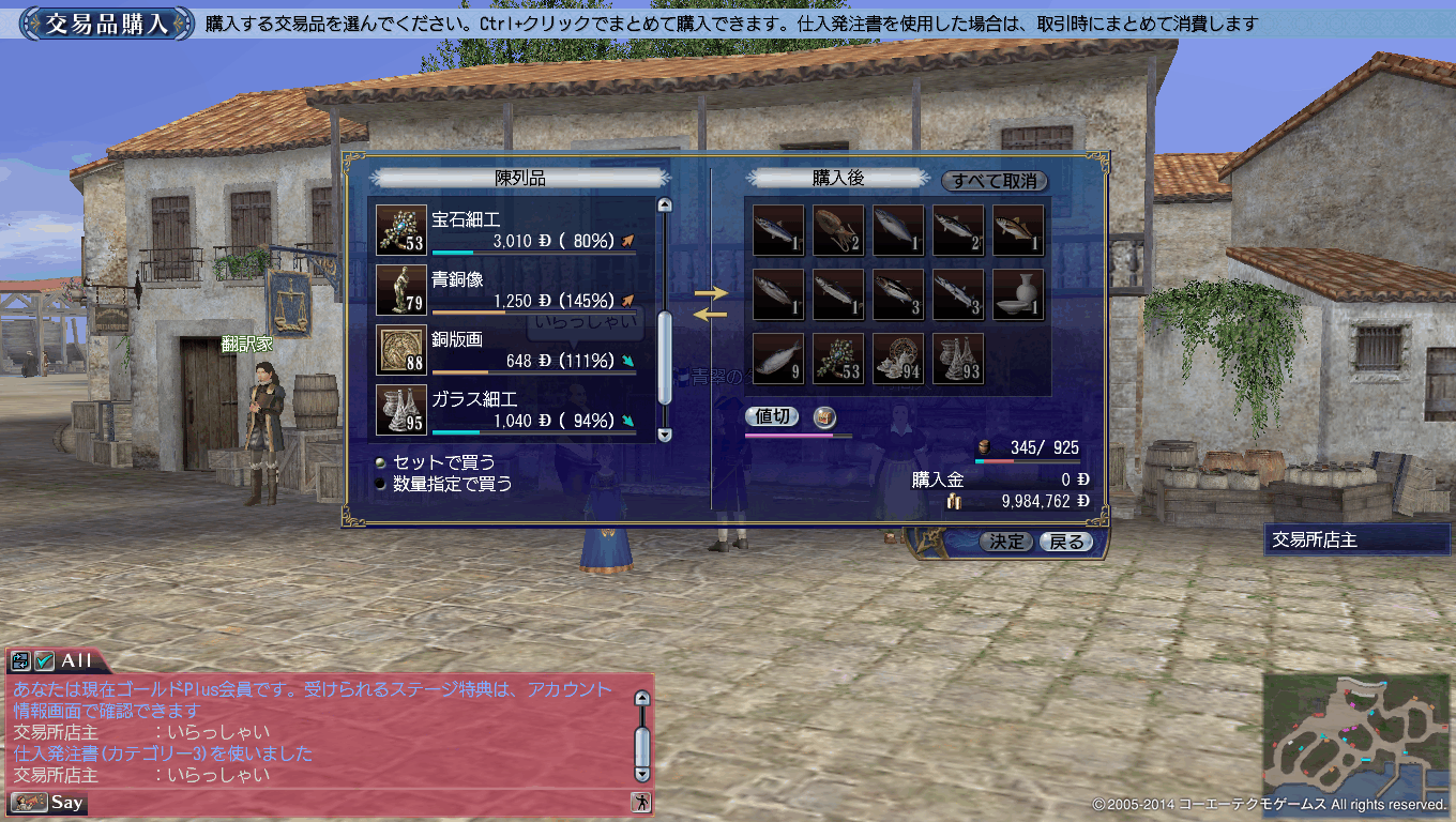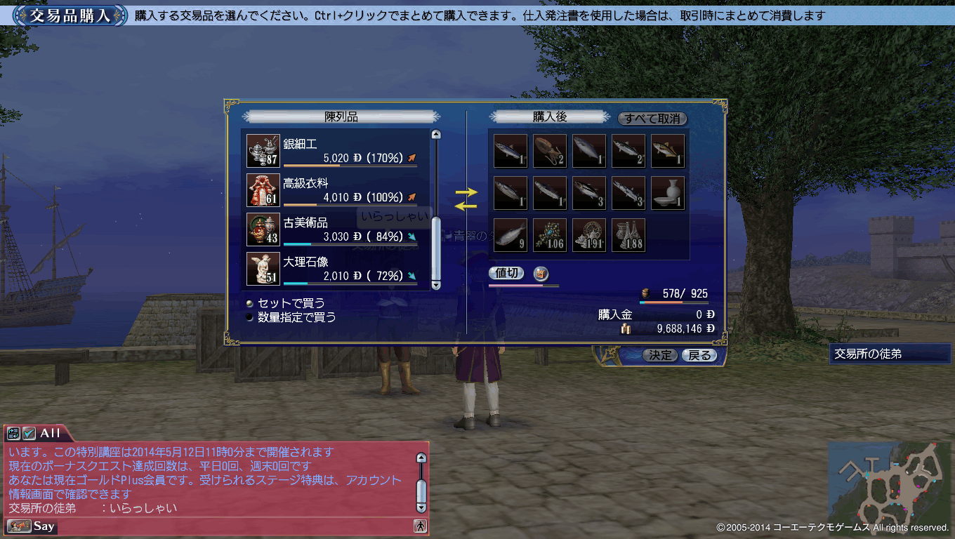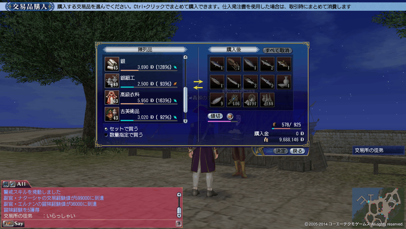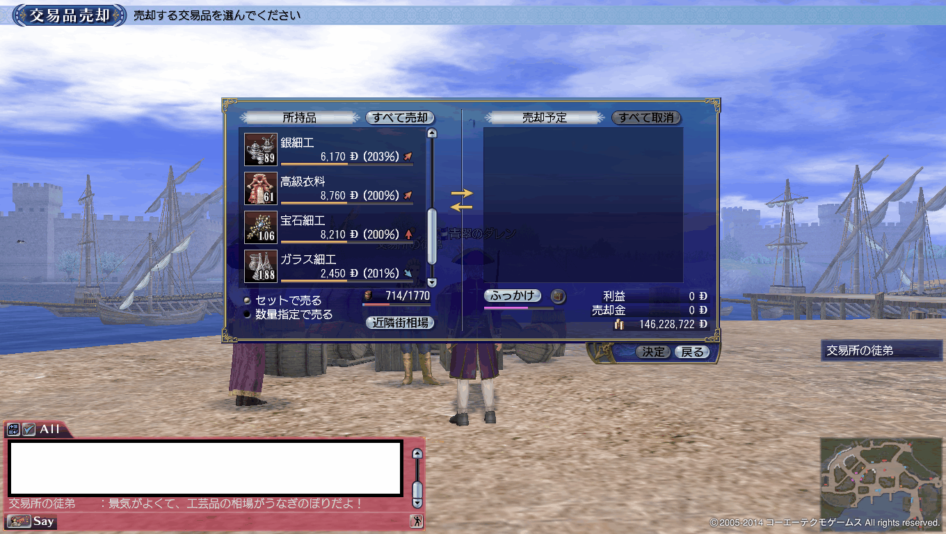 売却については下のスクリーンショットにございますが、高値で売りつけられ、かつ近郊で買える工芸品としては高級衣料が最大の儲けをもたらすようです。